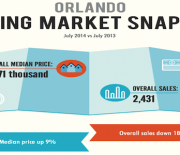 Closing of foreclosures in Orlando increased by 14.29 percent in when compared to July 2013. “Normal” home sales in Orlando decreased by 14.34 percent when compared to July 2013 and made up 67.34 percent of the sales pie. Closings of short sales decreased by 61.81 percent.